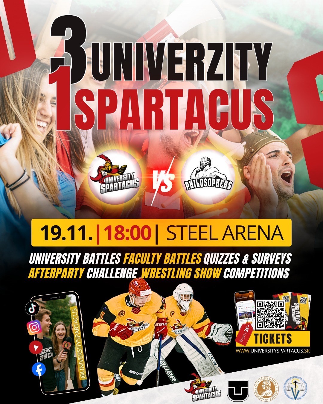 We invite you to the third home game of the university hockey league on Wednesday, November 19, 2025, in which University Spartacus Košice will once again face the Philosophers Nitra team. Come support your university team and help them build on their success from the last game.