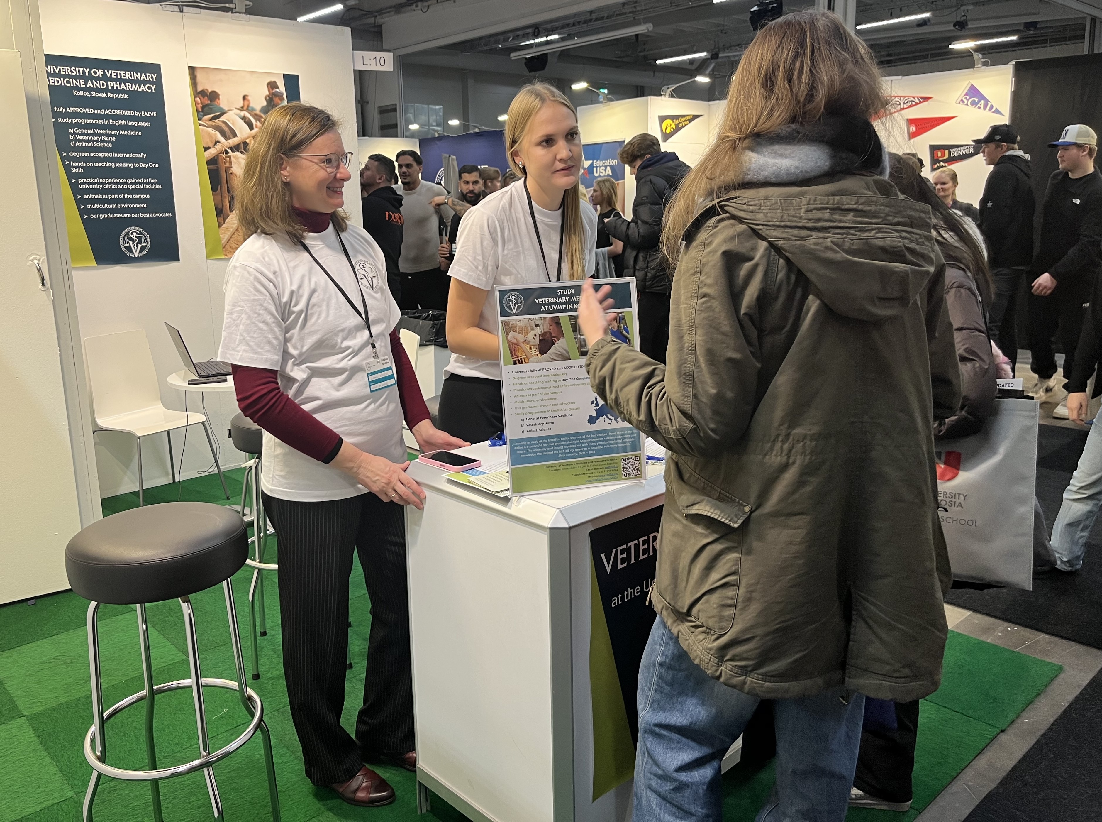 The University of Veterinary Medicine and Pharmacy in Košice is participating in one of the largest educational fairs in Sweden, the Saco Student Fair, which takes place on November 26-27, 2025, at Kistamässan in Stockholm. Our university is represented by Zuzana Kostecká, Vice-Rector for School Development and Quality Assessment, Diana Sokoliová from the Study Department - English Language Studies Section, and Tuva Lisa Margareta Wennerberg, a 4th-year student of the General Veterinary Medicine study program, who comes from Sweden. Their common goal is to promote the study programs General Veterinary Medicine, Veterinary Nursing, and Animal Science.