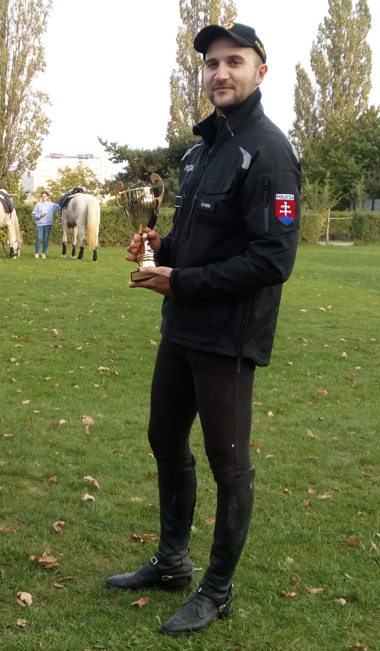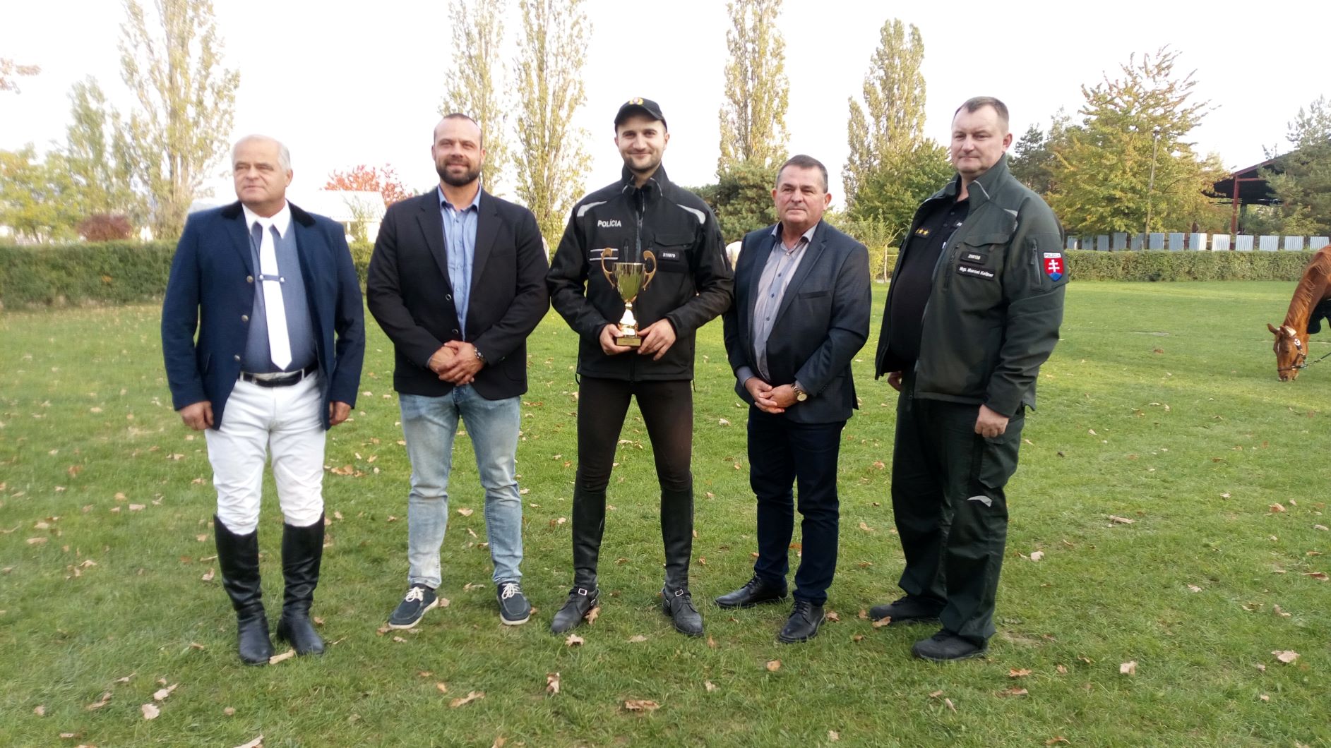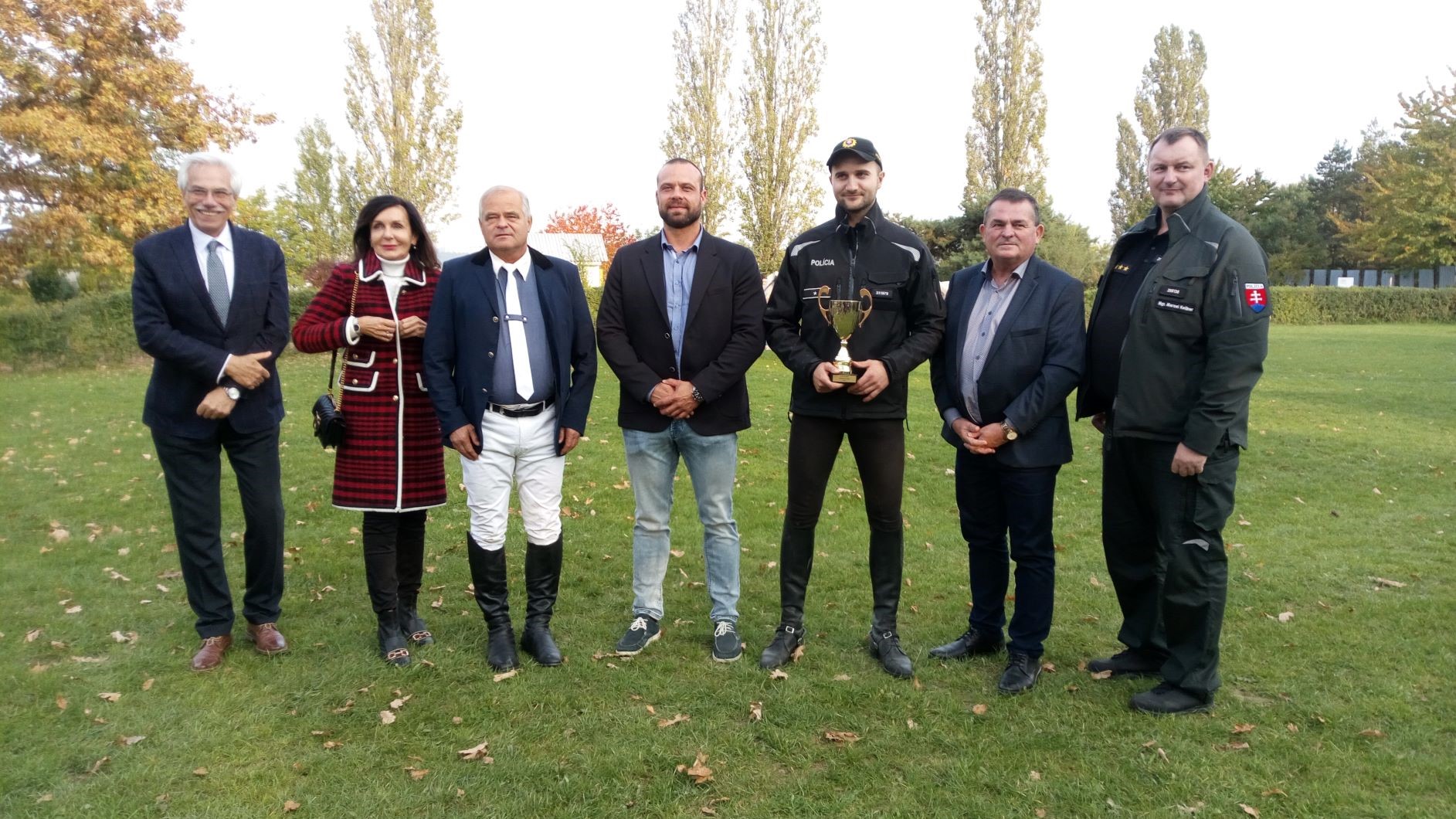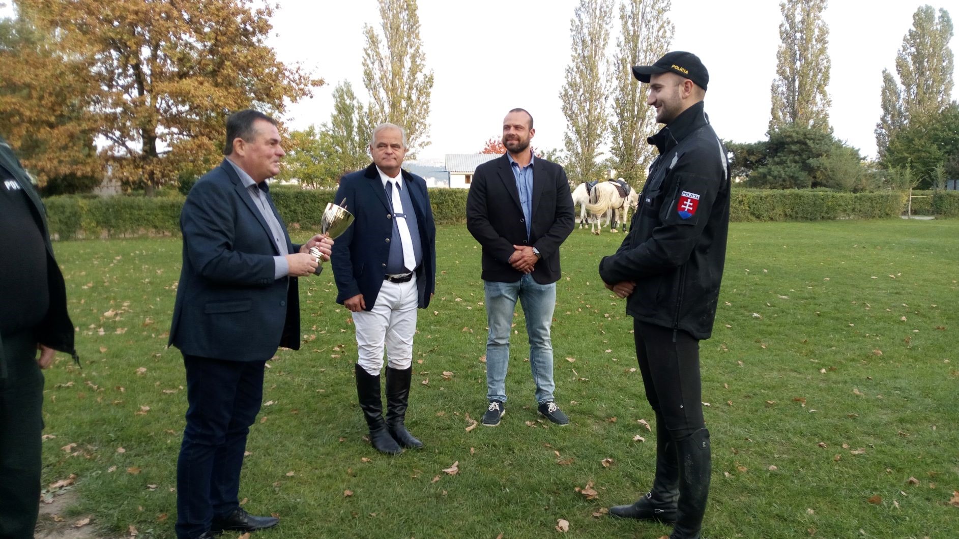 Prorektor UVLF Jozef Nagy odovzdáva pohár najlepšiemu jazdcovi por. Mariánovi Zgolovi.