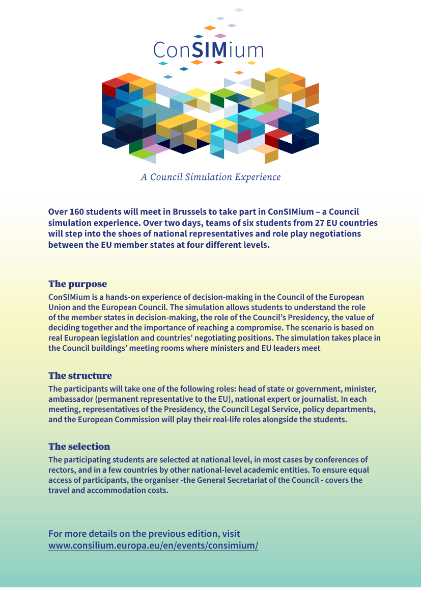Projekt ConSIMium majú v rukách študenti, ktorí zastupujú svoju krajinu. Ich výber na národnej úrovni realizujú partneri hlavného organizátora podľa dohodnutých princípov a kritérií. Študentov bude viesť a poskytovať im podporu národný koordinátor. Národné tímy študentov budú simulovať zasadnutia na piatich rozličných úrovniach a v politikách, ktoré určí hlavný organizátor. Simulácie ConSIMium sa uskutočnia v Bruseli 4. - 7. februára 2026.