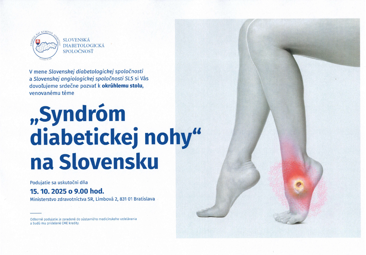 Aktuálnej téme syndrómu diabetickej nohy na Slovensku bolo venované pracovné stretnutie hlavných odborníkov Slovenskej diabetologickej spoločnosti, Slovenskej angiologickej spoločnosti, Slovenskej chirurgickej spoločnosti a vybraných lekárskych tímov. Uskutočnilo sa 15. októbra 2025 na Ministerstve zdravotníctva SR pod záštitou Slovenskej diabetologickej spoločnosti. Pri okrúhlom stole naši kolegovia prezentovali možnosti a doterajšie skúsenosti s terapeutickými postupmi pri liečbe diabetickej nohy u ľudí.