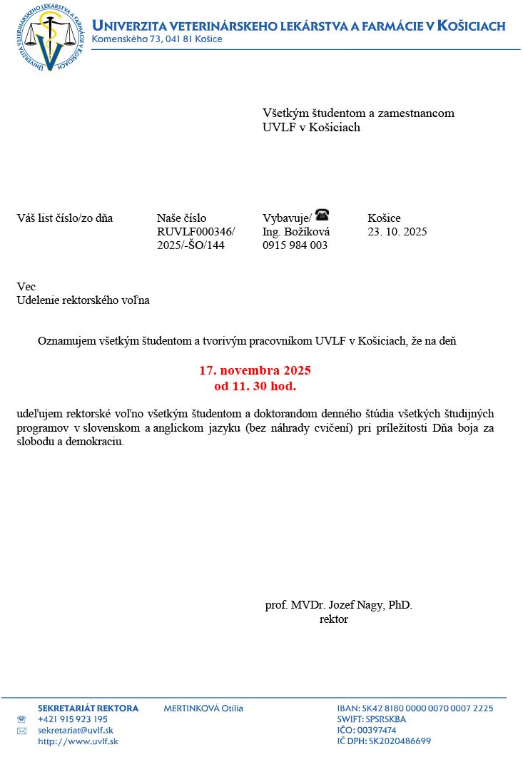 v prílohe Vám zasielame informáciu o udelení rektorského voľna dňa 17. novembra 2025 pri príležitosti Medzinárodného dňa študentstva a Dňa boja za slobodu a demokraciu.