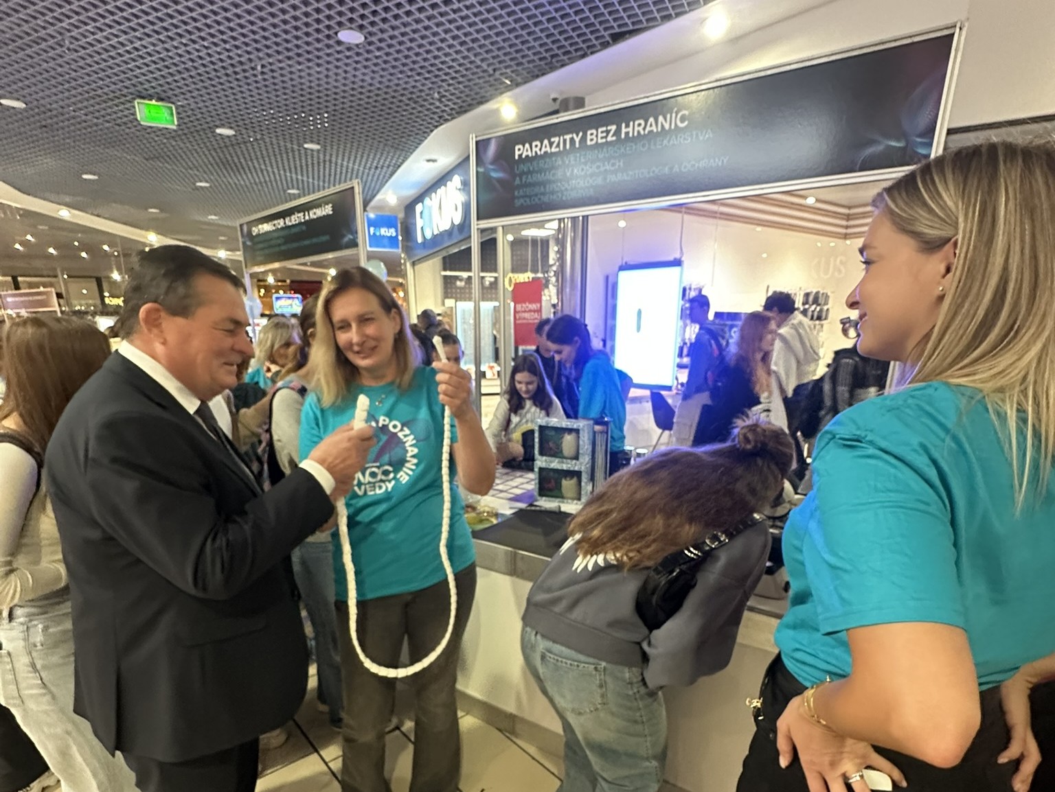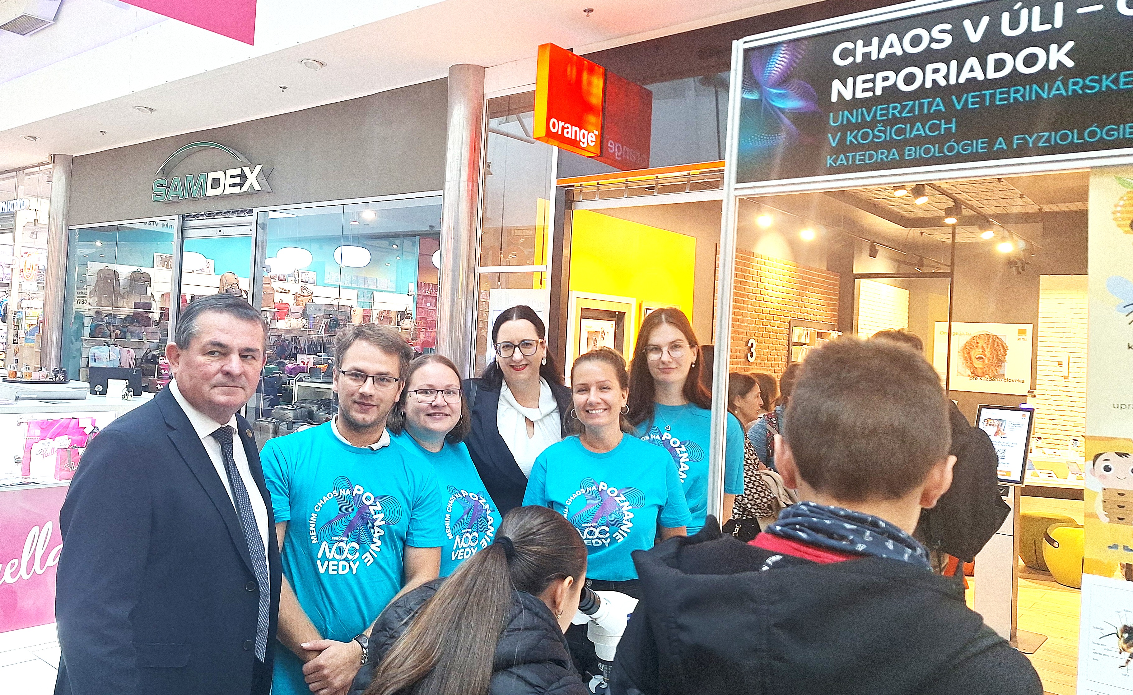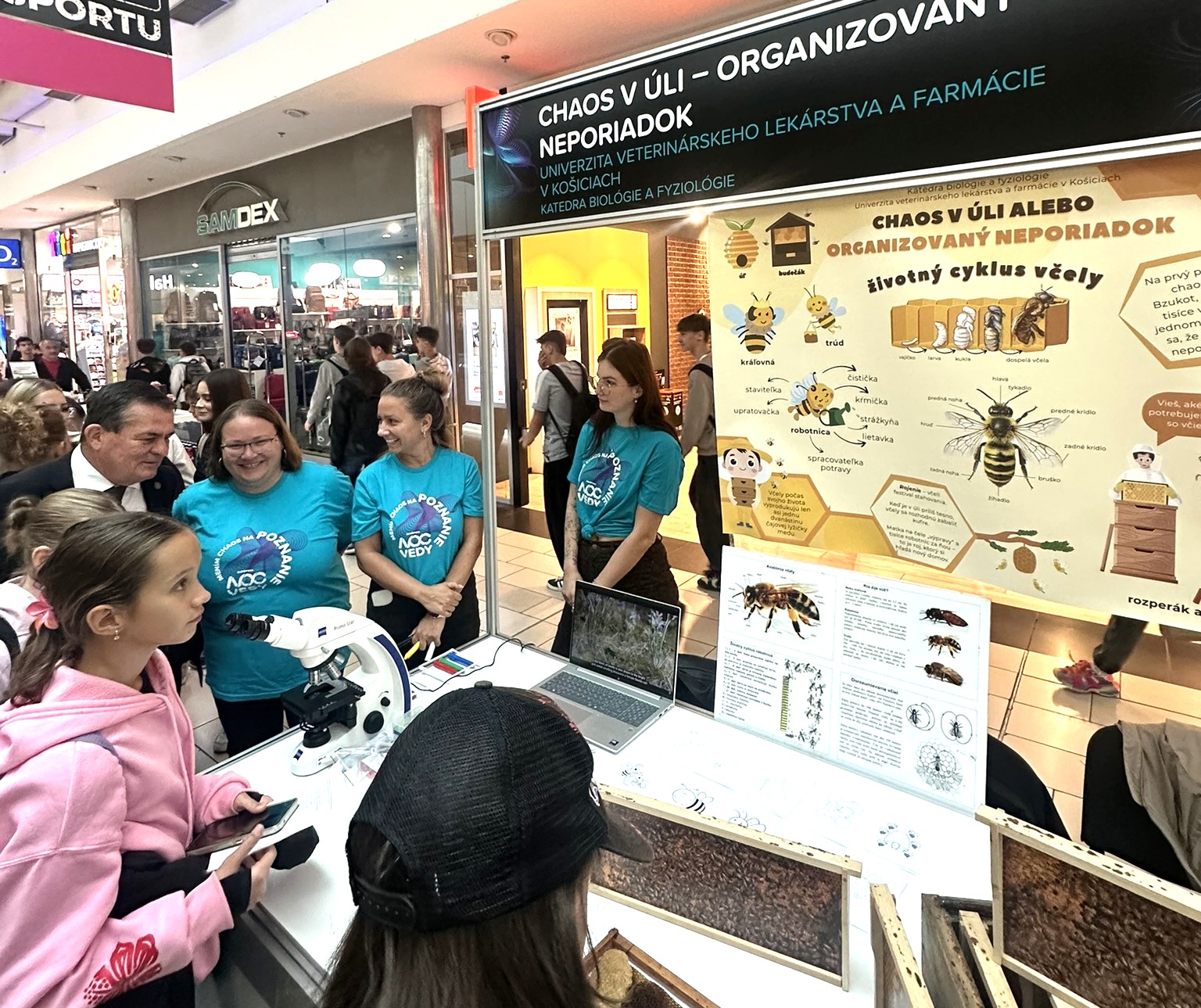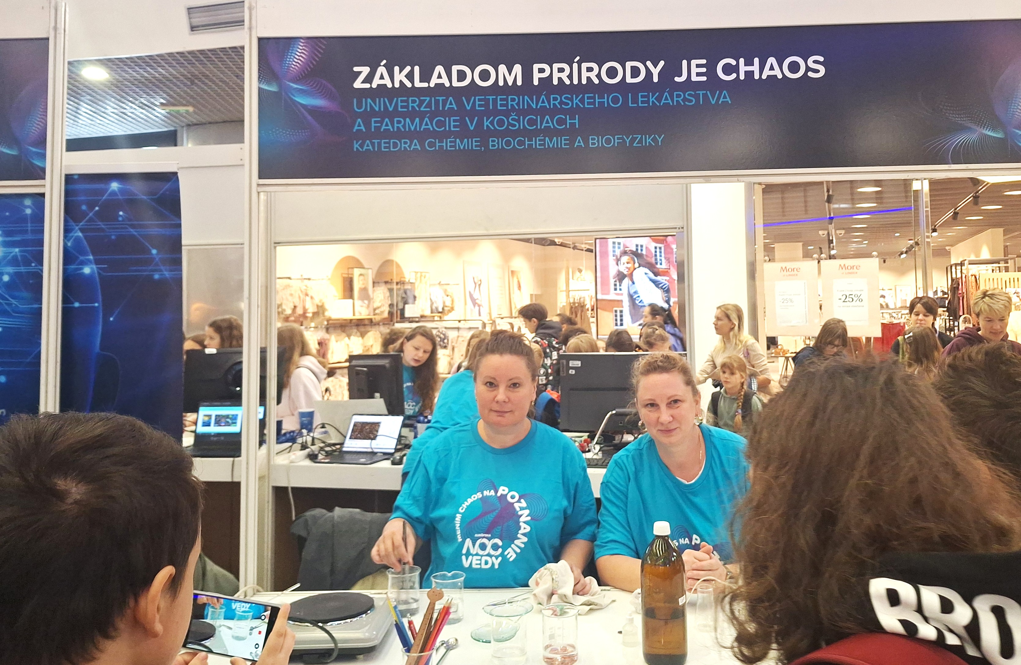 Univerzita veterinárskeho lekárstva a farmácie v Košiciach sa prezentovala v 11 stánkoch: Bubliny, plutvy a ich tajomstvá (AQUA-TERA klub), Chaos v úli – Organizovaný neporiadok (katedra biológie a fyziológie), Mikroskopom do zákulisia života (katedra mikrobiológie a imunológie), Misia život (klinika malých zvierat), Od poriadku k chaosu: Príbeh jednej bunky (katedra morfologických disciplín), OH SURVector: Kliešte a komáre (katedra epizootológie, parazitológie a ochrany spoločného zdravia), Parazity bez hraníc (katedra epizootológie, parazitológie a ochrany spoločného zdravia), Pod šupinami (AQUA-TERA klub), Príprava rastlinných kapsúl – chaos alebo poriadok (katedra farmaceutickej technológie, farmakognózie a botaniky), Z ríše krídel a fúzikov (Klub chovateľov malých cicavcov a exotických vtákov), Základom prírody je chaos (katedra chémie, biochémie a biofyziky). Ďakujeme všetkým kolegyniam a kolegom, ktorí sa podieľali na príprave aj realizácii tohto podujatia v Košiciach. Našu univerzitu sa im podarilo zviditeľniť skvelým spôsobom. ĎAKUJEME!