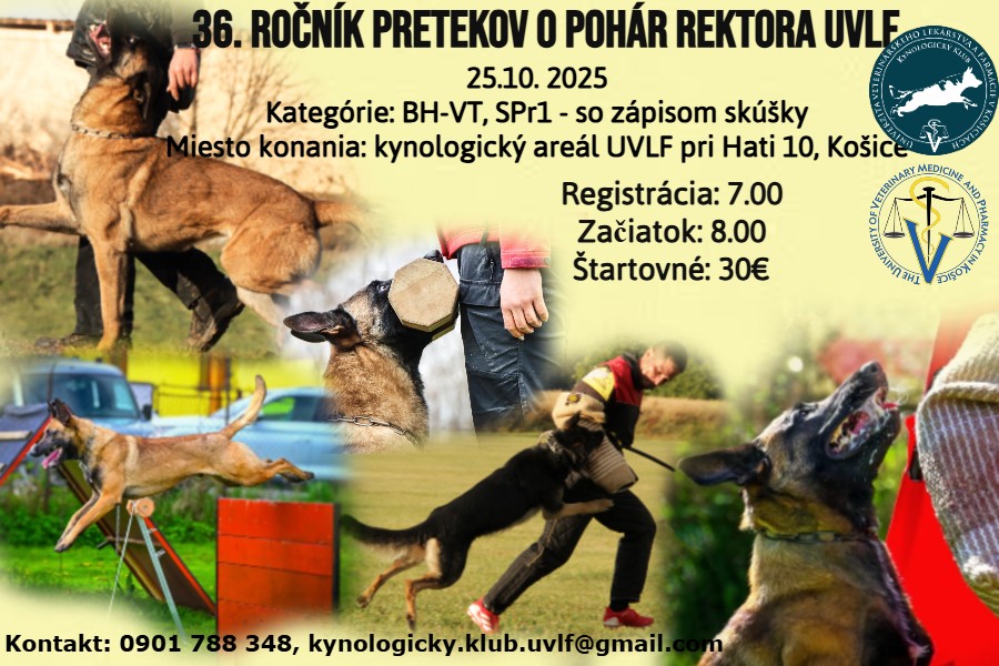 Študenti Kynologického klubu UVLF v sobotu 25. októbra 2025 zorganizovali 36. ročník pretekov O pohár rektora UVLF v športovej kynológii. Pretekalo sa podľa Medzinárodného skúšobného poriadku pracovných psov (FCI-IGP) v kategóriách FCI BH-VT a v špeciálnej kategórii FCI-SPr1 so zameraním na obranu. Preteky prebiehali na kynologickom cvičisku UVLF Pri Hati 10. Rozhodkyňu Darinu Šarišskú delegoval Zväz športovej kynológie (ZŠK) SR a figurantom bol Milan Mihok.