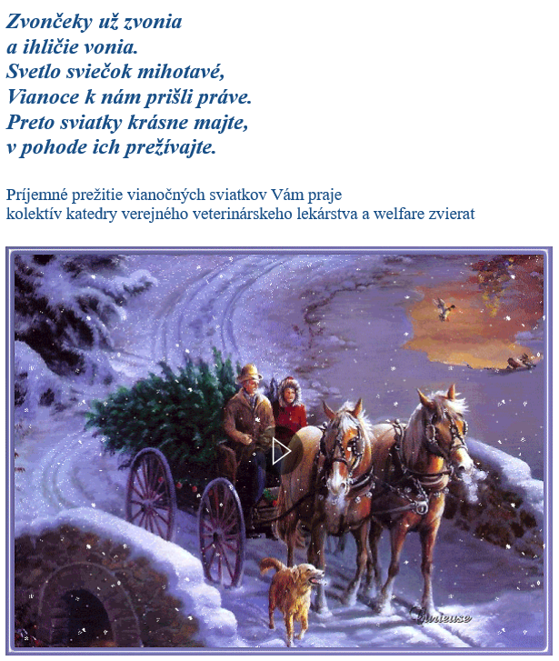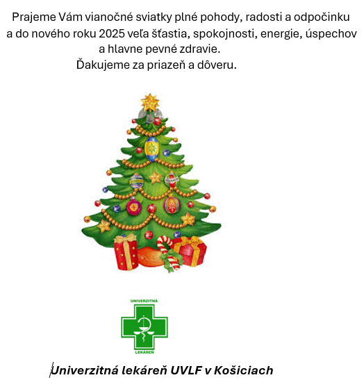 Univerzitu veterinárskeho lekárstva a farmácie v Košiciach tvorí množstvo pracovísk, katedier, kliník, účelových zariadení... Univerzitu tvoria študenti i pedagogickí, vedeckí a ďalší zamestnanci... Všetci spoločne si želáme, aby vianočné sviatky priniesli do našich rodín radosť, pokoj, pohodu, lásku a spolupatričnosť. Všetci spoločne si želáme, aby ľuďom i zvieratám slúžilo zdravie, aby bola zdravá naša spoločnosť i planéta, na ktorej žijeme.
