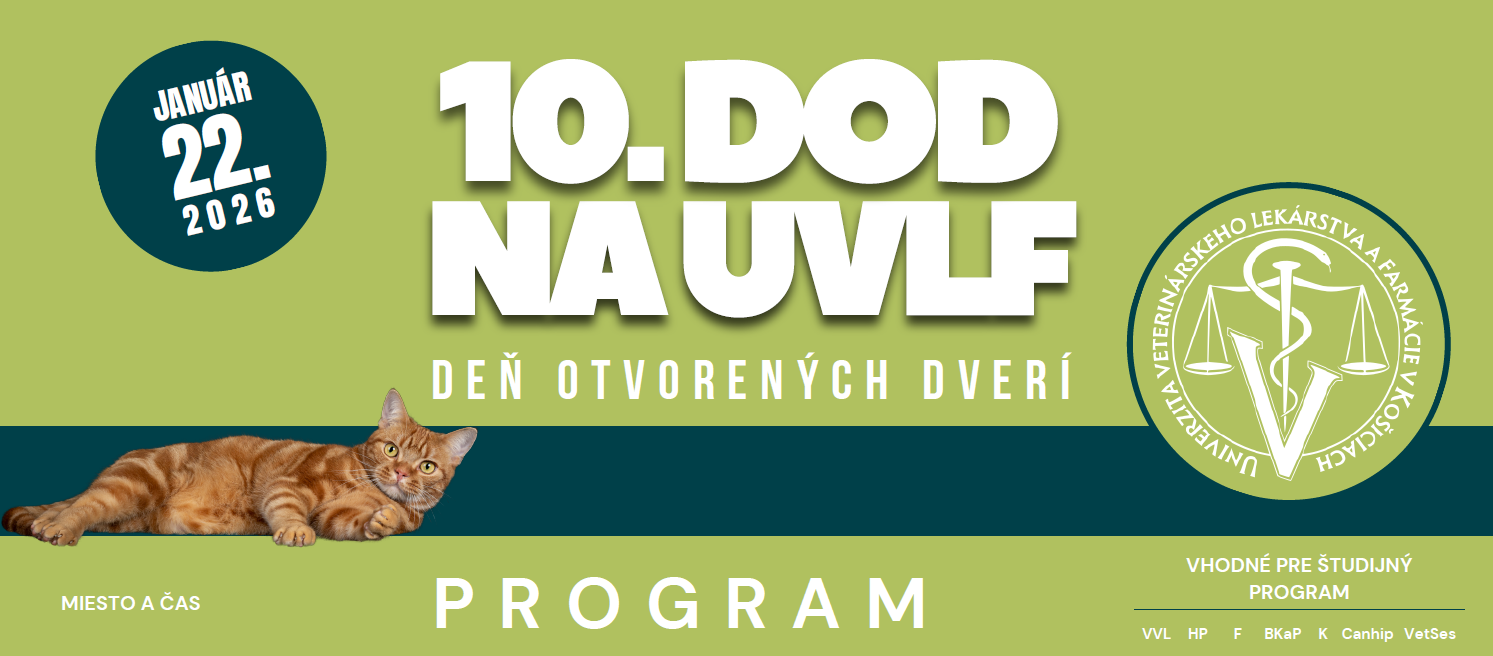 Vo štvrtok 22. januára 2026 pripravuje Univerzita veterinárskeho lekárstva a farmácie v Košiciach DEŇ OTVORENÝCH DVERÍ UVLF. Záujemcovia o štúdium si budú môcť na vlastné oči obzrieť to, čo ich najviac zaujíma a pýtať sa pedagógov, študentov i pracovníčok študijného oddelenia.