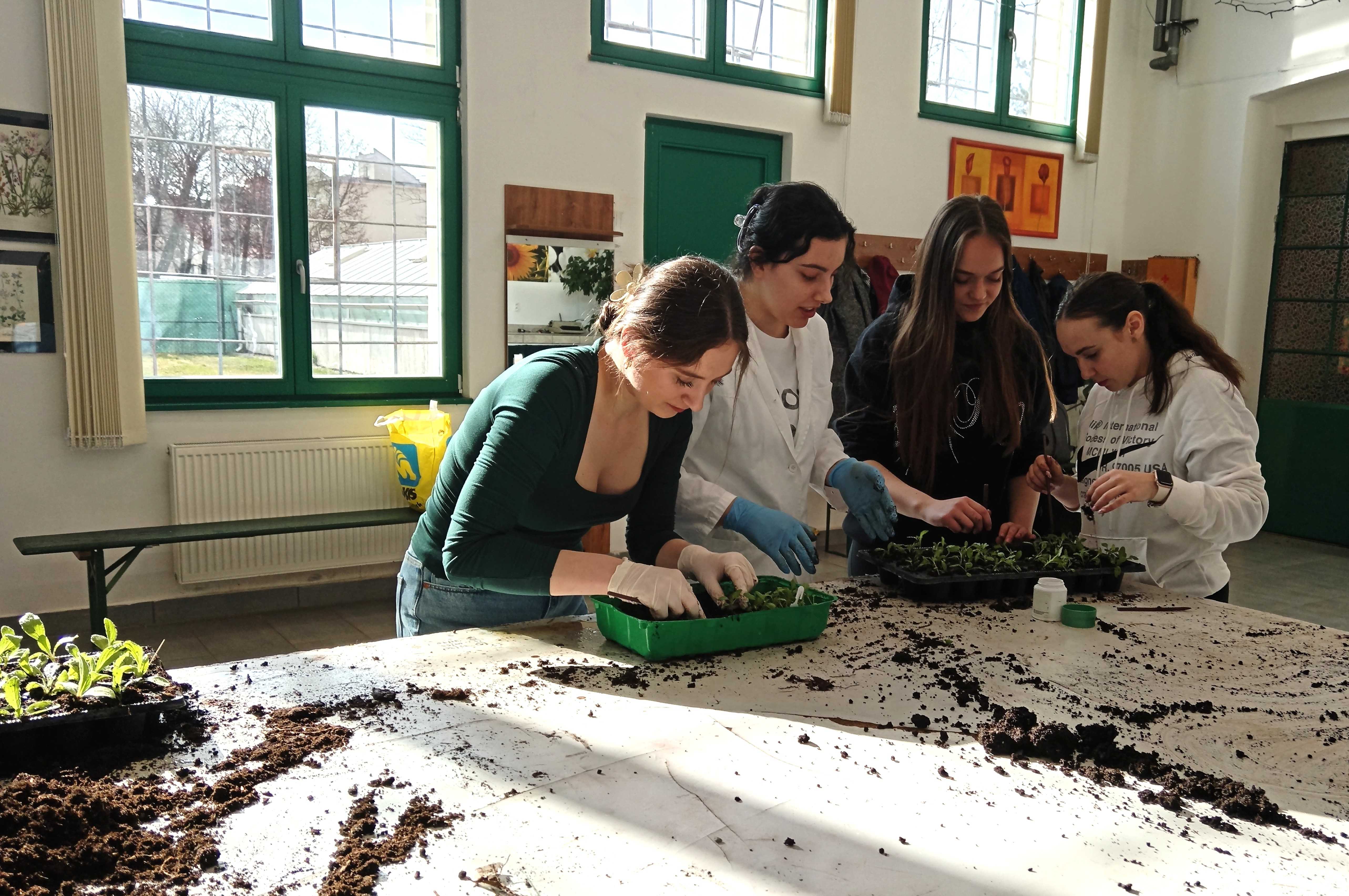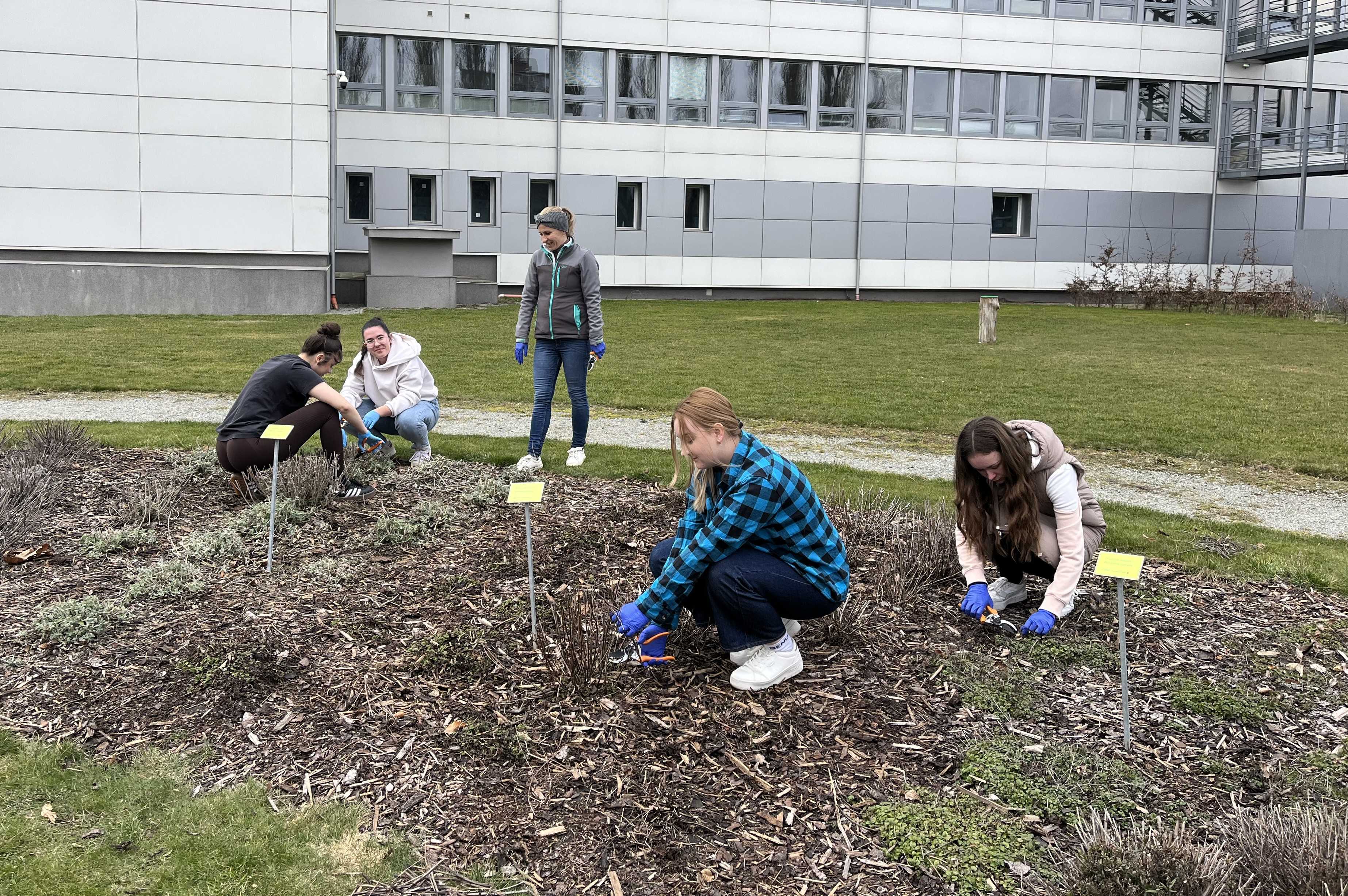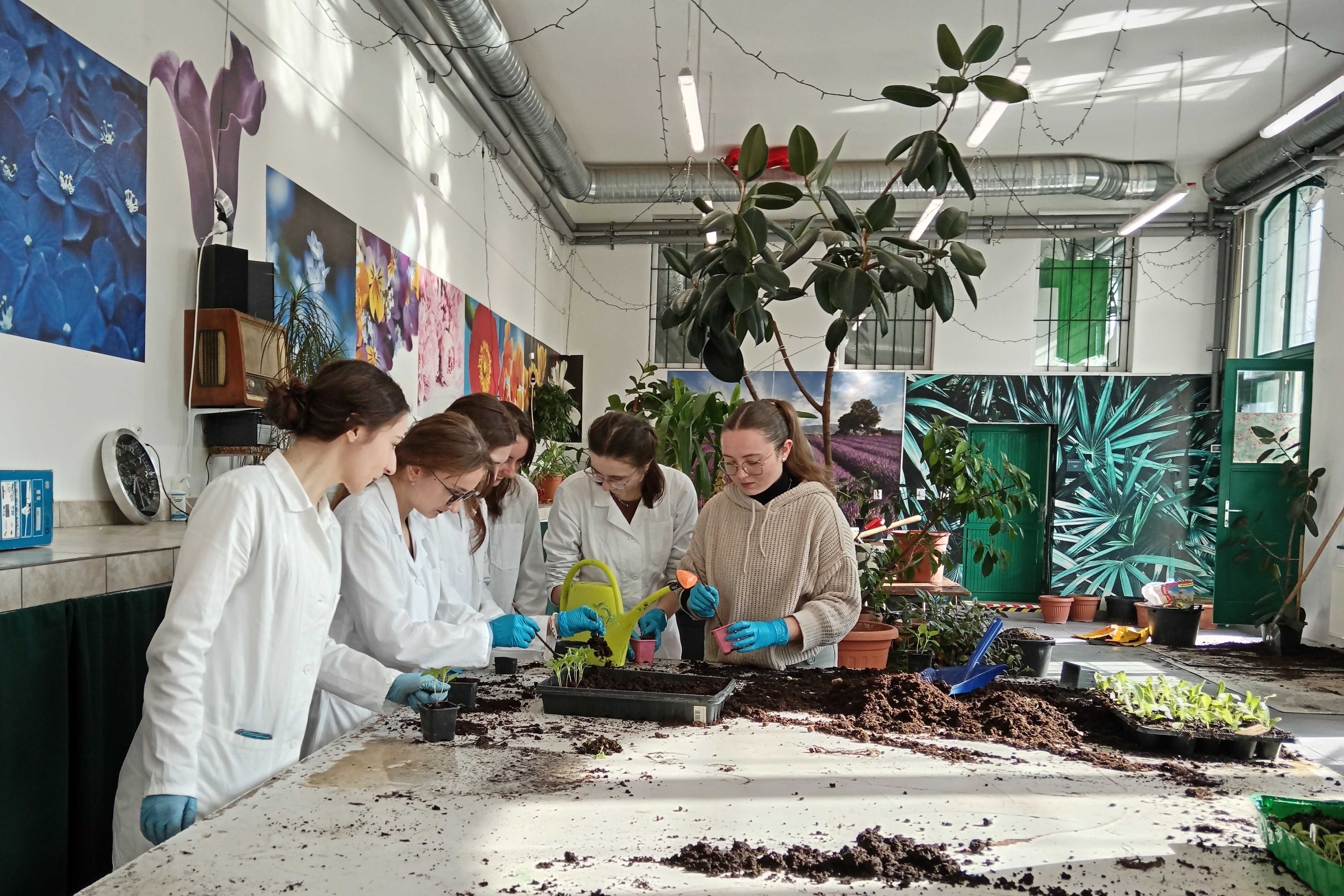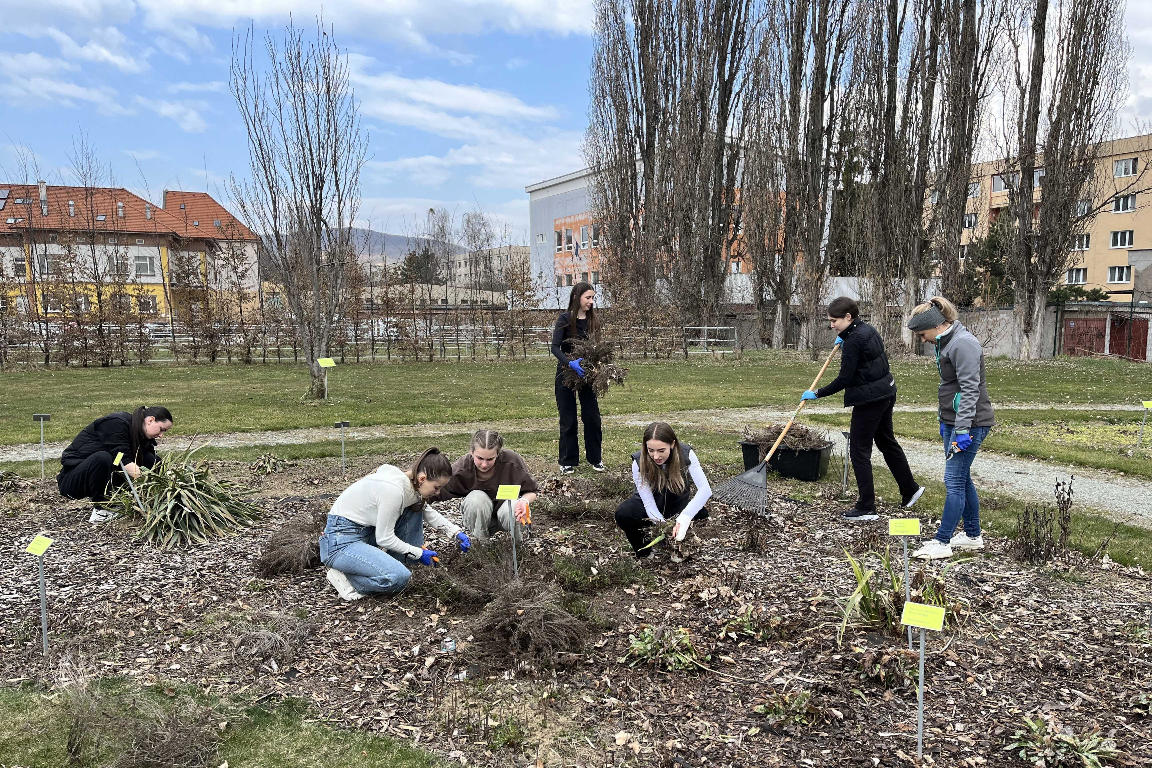 Študentky prvého ročníka študijného programu farmácia sa v rámci cvičení pod vedením doc. RNDr. Miriam Bačkorovej, PhD., a RNDr. Veroniky Petruľovej, PhD., z katedry farmaceutickej technológie, farmakognózie a botaniky sa preto vo štvrtok 12. marca 2026 pustili do práce v univerzitnej záhrade liečivých rastlín, ktorú treba po zime vyhrabať a vyčistiť, ale i v skleníku, kde treba pripraviť rôzne druhy priesad.