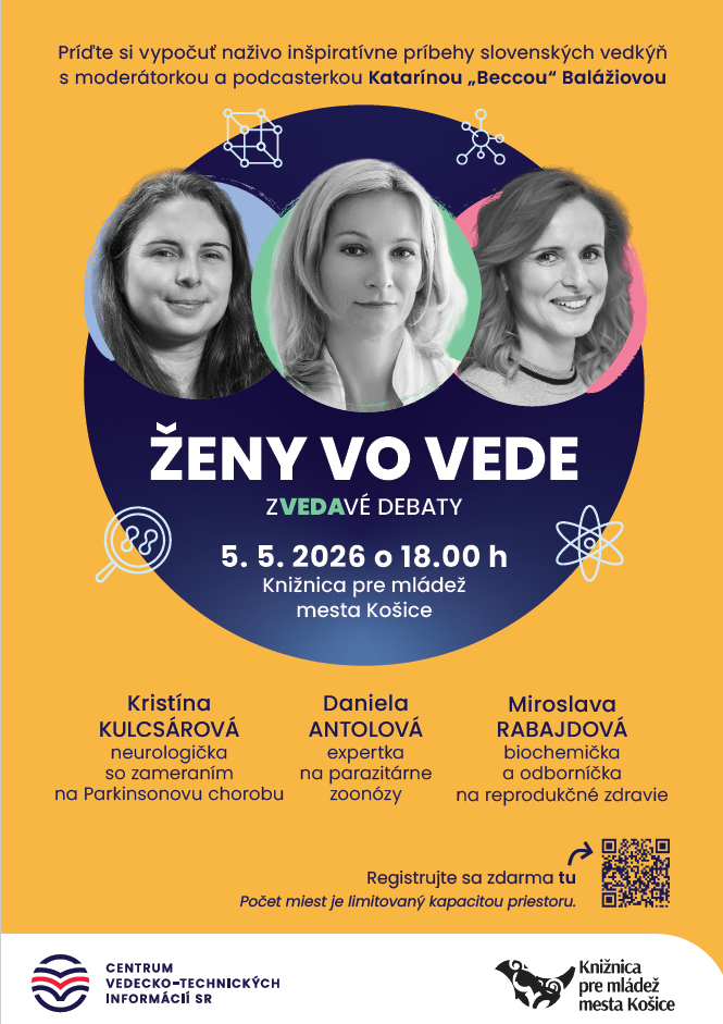 Národné centrum pre popularizáciu vedy a techniky v spoločnosti (NCP VaT) pri Centre vedecko-technických informácií (CVTI SR) pripravuje v utorok 5. mája o 18.00 hod. v priestoroch Knižnice pre mládež mesta Košice v Kasárňach/Kulturpark na Kukučínovej 2 v Košiciach zaujímavé podujatie „Ženy vo vede“. Upriamuje pozornosť na výnimočné slovenské vedkyne, ktoré sa presadili v oblasti výskumu a akademického pôsobenia a zároveň otvára verejný dialóg o výzvach, ktoré ženám vstupujúcim do sveta vedy často stoja v ceste. Zvedavé debaty si kladú za cieľ popularizovať vedu a ukázať, že výskum a objavy formujú aj ženy – s vášňou, vytrvalosťou a expertízou.